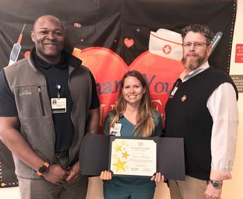 Photo caption: Sara Hudson, RN, BSN, proudly displays her Hero Award alongside Chief Human Resources Officer Elliott Willis and Chief Executive Officer Jason Hirsbrunner.