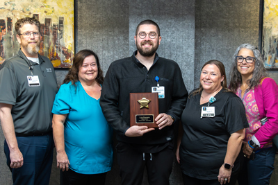 Photo caption: Luis Romero, CSFA (center) is pictured in the attached photo proudly displaying his PEER Award alongside (from left to right) Chief Executive Officer Jason Hirsbrunner, Clinical Services Coordinator Cindy O’Steen, RN, Clinical Services LPN Team Leader Brittany Wiesen, LPN, and Clinical Services Director Dawn Kirchner.