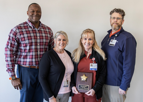 Betty Knowles, RN (center) is pictured in the attached photo proudly displaying her PEER Award alongside (from left to right) Chief Human Resources Officer Elliott Willis, Clinical Services Director Cassie Corneal, and Chief Executive Officer Jason Hirsbrunner.